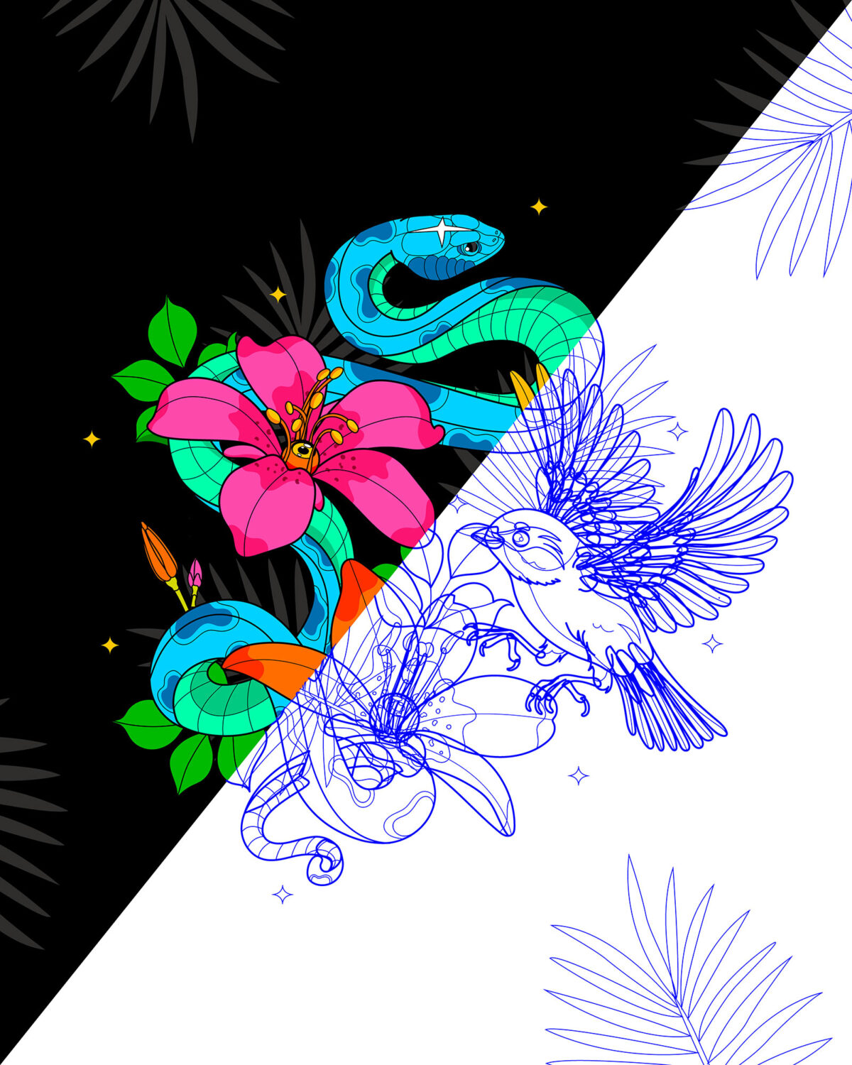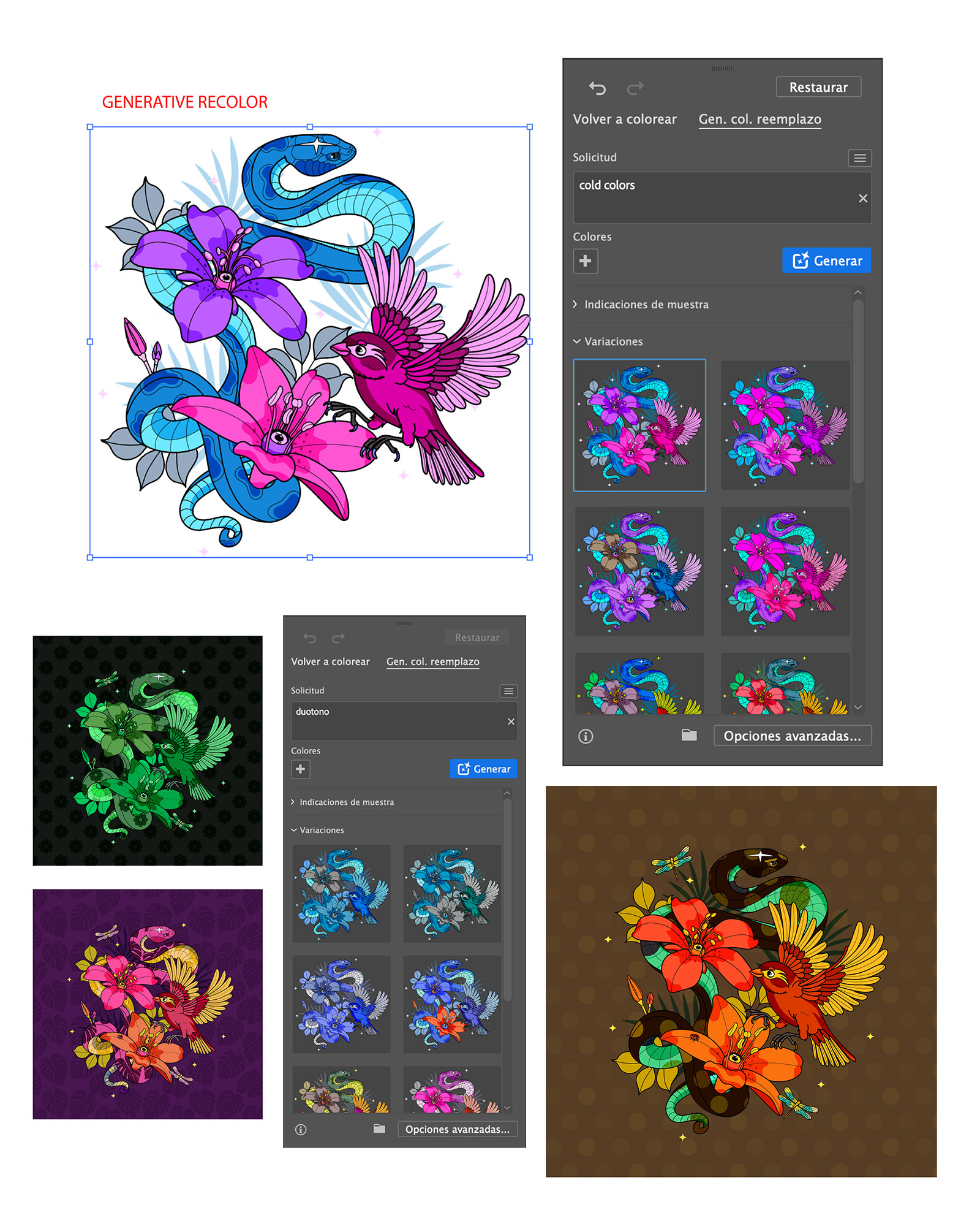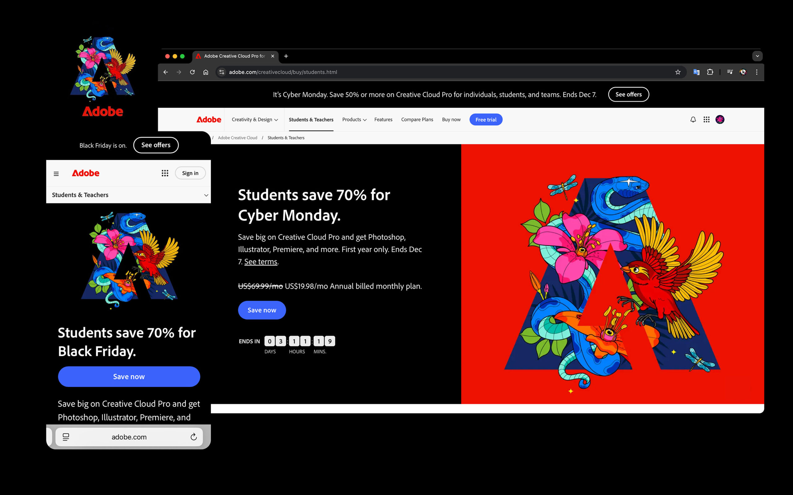 Carolina Peláez was commissioned by Adobe to illustrate a vibrant hero image for their Creative Cloud Black Friday Campaign. Carolina’s nature-inspired vector artwork was animated to incorporate the design into the iconic Adobe logo and reveal different color schemes achieved with their generative recolor feature.