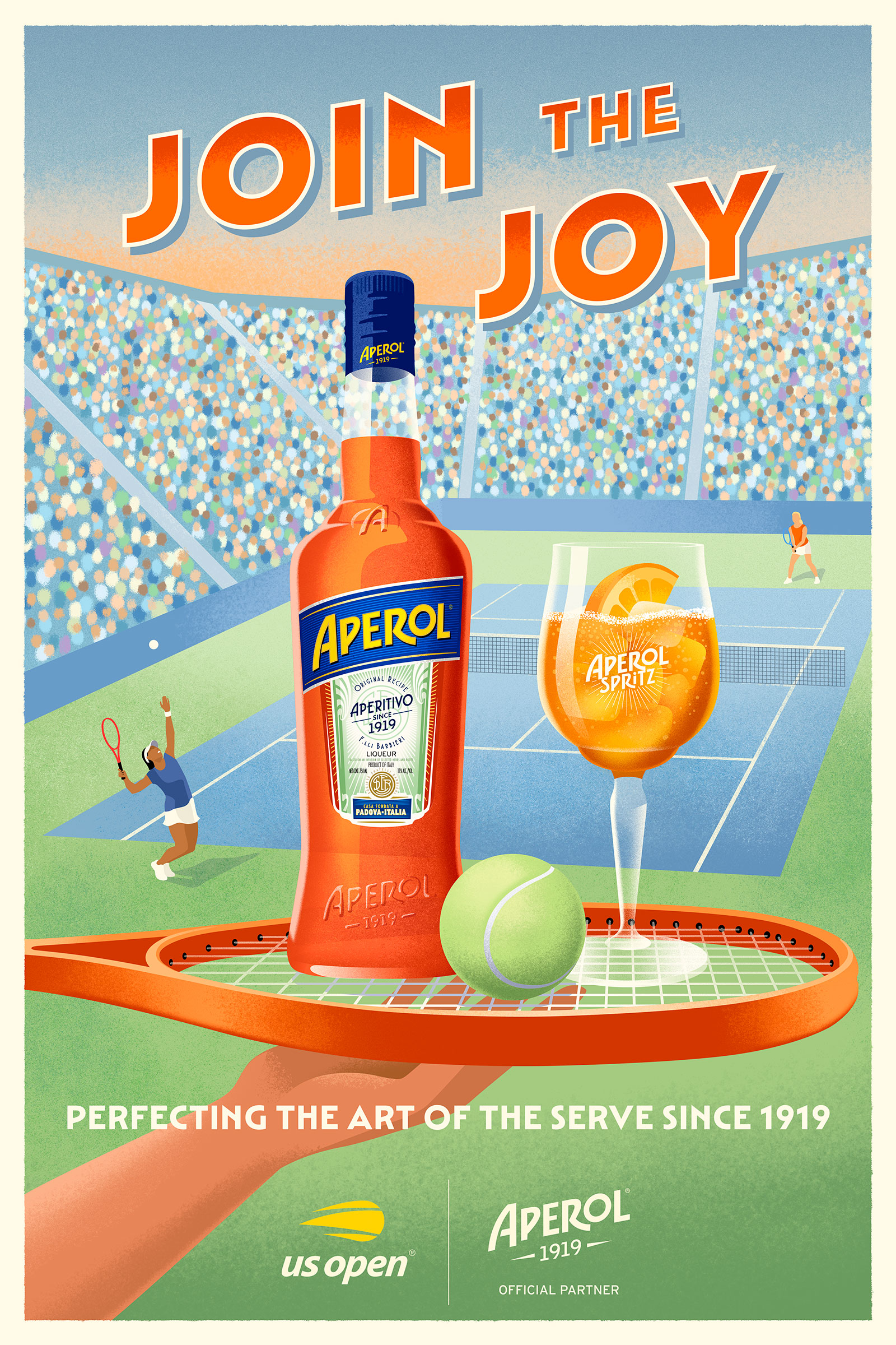 Michael Crampton worked with VML on a vintage-style poster illustration for Aperol, an official partner of the 2024 US Open Tennis Championships. The poster is displayed throughout New York City as part of their campaign in celebration of the tournament.