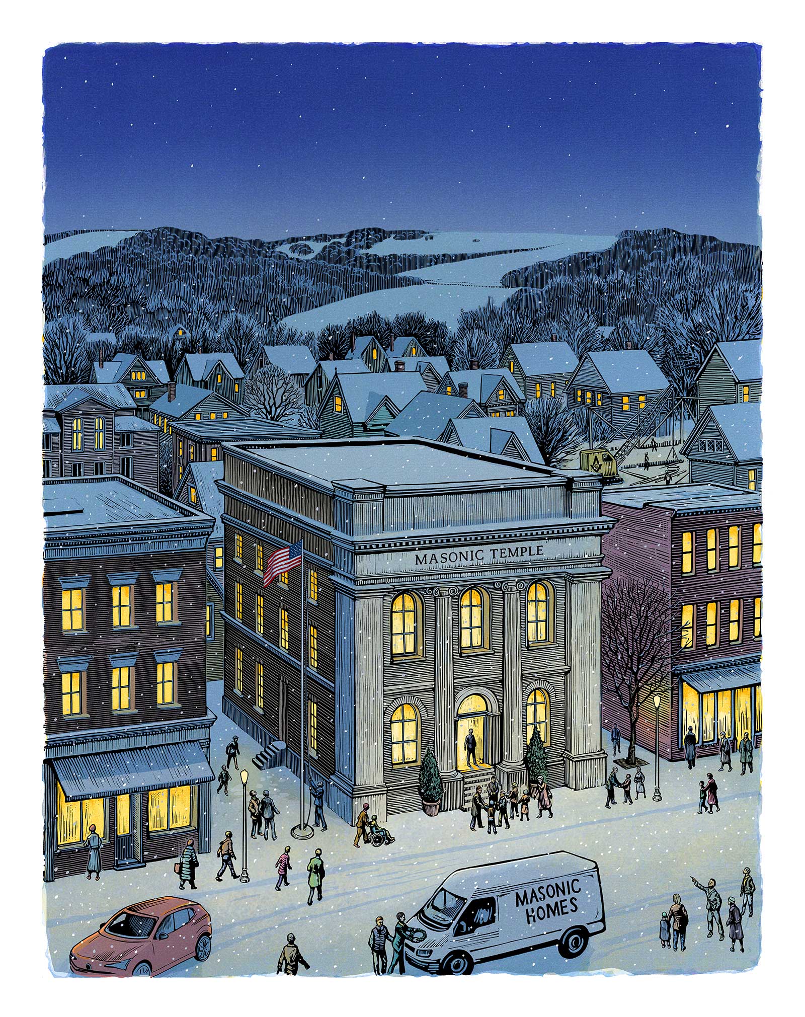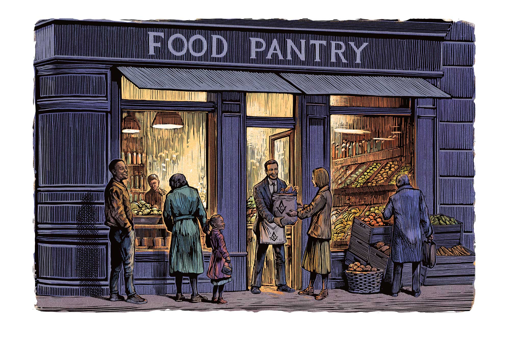 Chris Wormell illustrated the cover and two inside pieces for the Winter 2026-2026 issue of California Freemason magazine, all about giving back to the community. The cover illustration is a pastiche of William Hogarth’s 1738 engraving Night, transforming the originally satirical London scene into one of warmth and community.