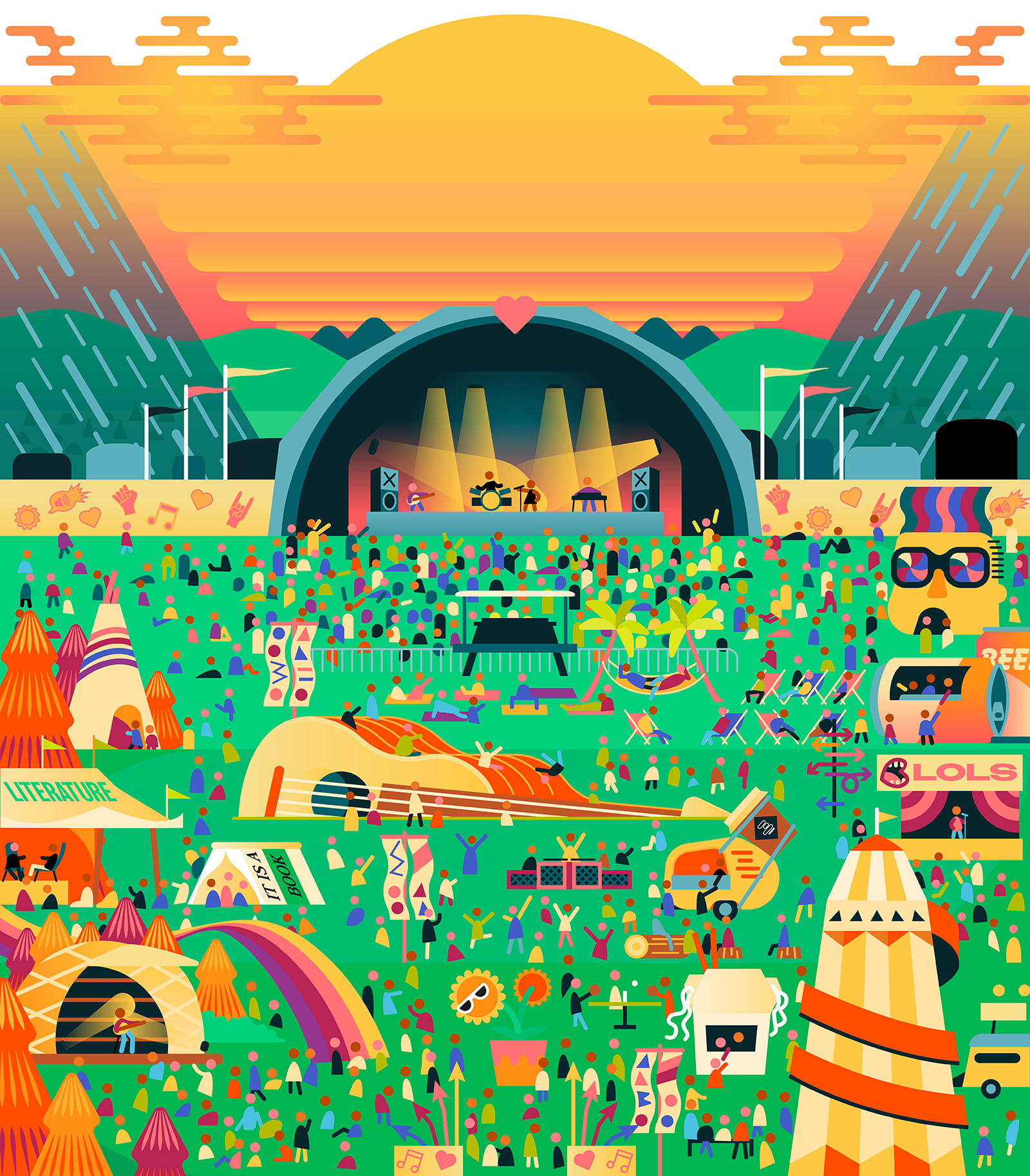 Ben the Illustrator was commissioned to create illustrations for the summer Festival Guide for The Big Issue. Ben designed the cover illustration, which was then separated into several scenes that highlighted some of the festival’s attractions, such as both the main and smaller stage, family play areas, and the food and beverage offerings.