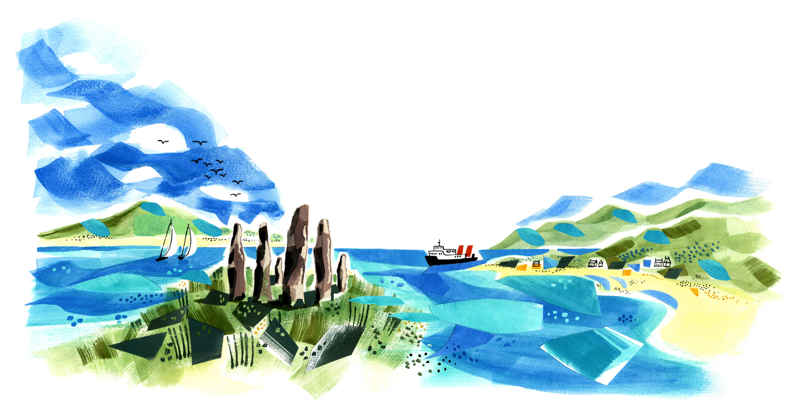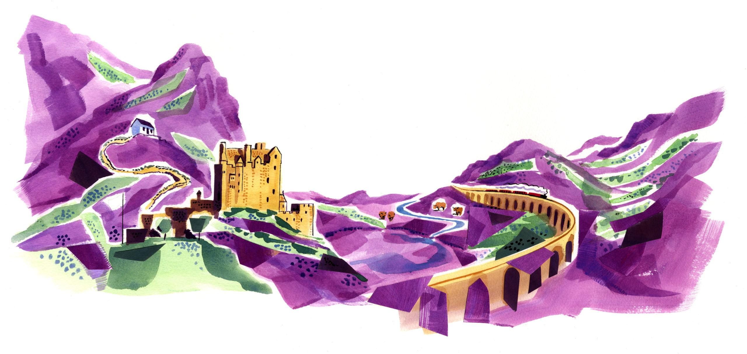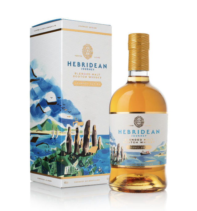 Sarah McMenemy illustrated a set of four labels for the Hunter Laing series of Scotch Malt Whiskies, each one based on quintessential locations across Scotland; Campbeltown, Islay, The Hebrides, and The Highlands.