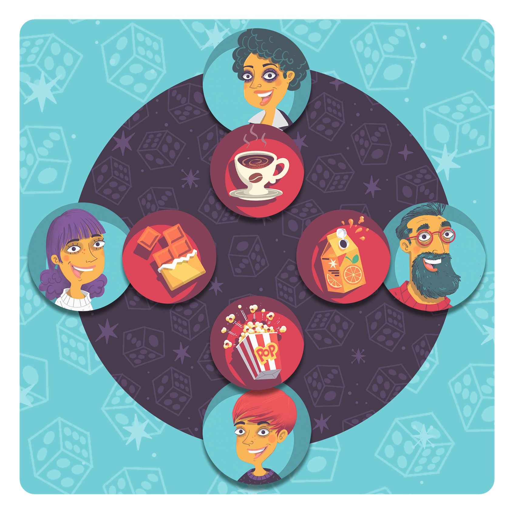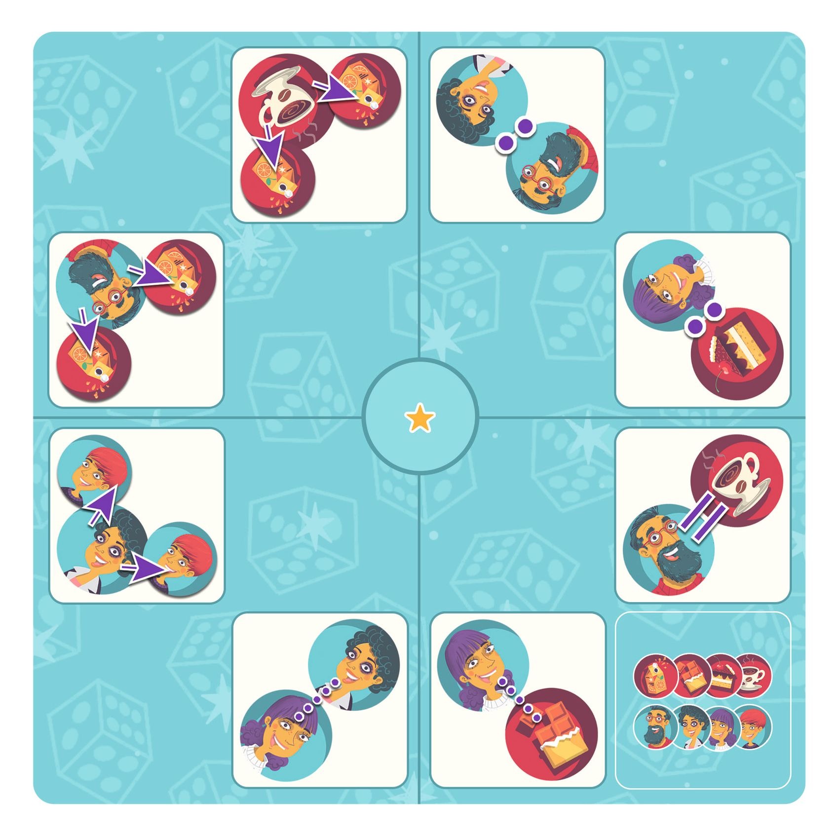 Steve Simpson worked with Djeco to illustrate a set of characters, foods and objects for the puzzle game “Qui a Quoi?” (Who Has What?). The game requires teamwork between players to share clues and deduce which objects belong to which characters.