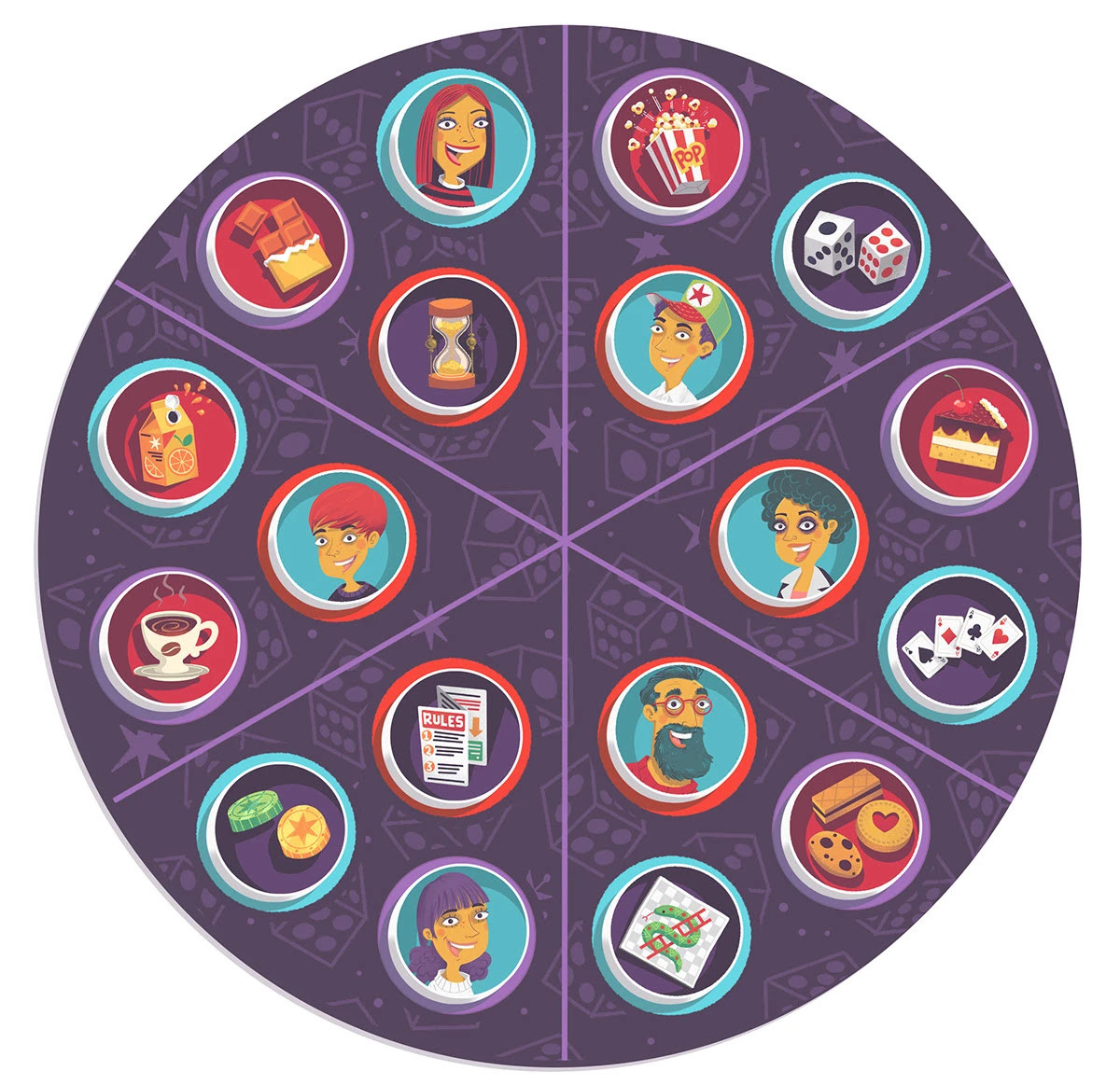 Steve Simpson worked with Djeco to illustrate a set of characters, foods and objects for the puzzle game “Qui a Quoi?” (Who Has What?). The game requires teamwork between players to share clues and deduce which objects belong to which characters.