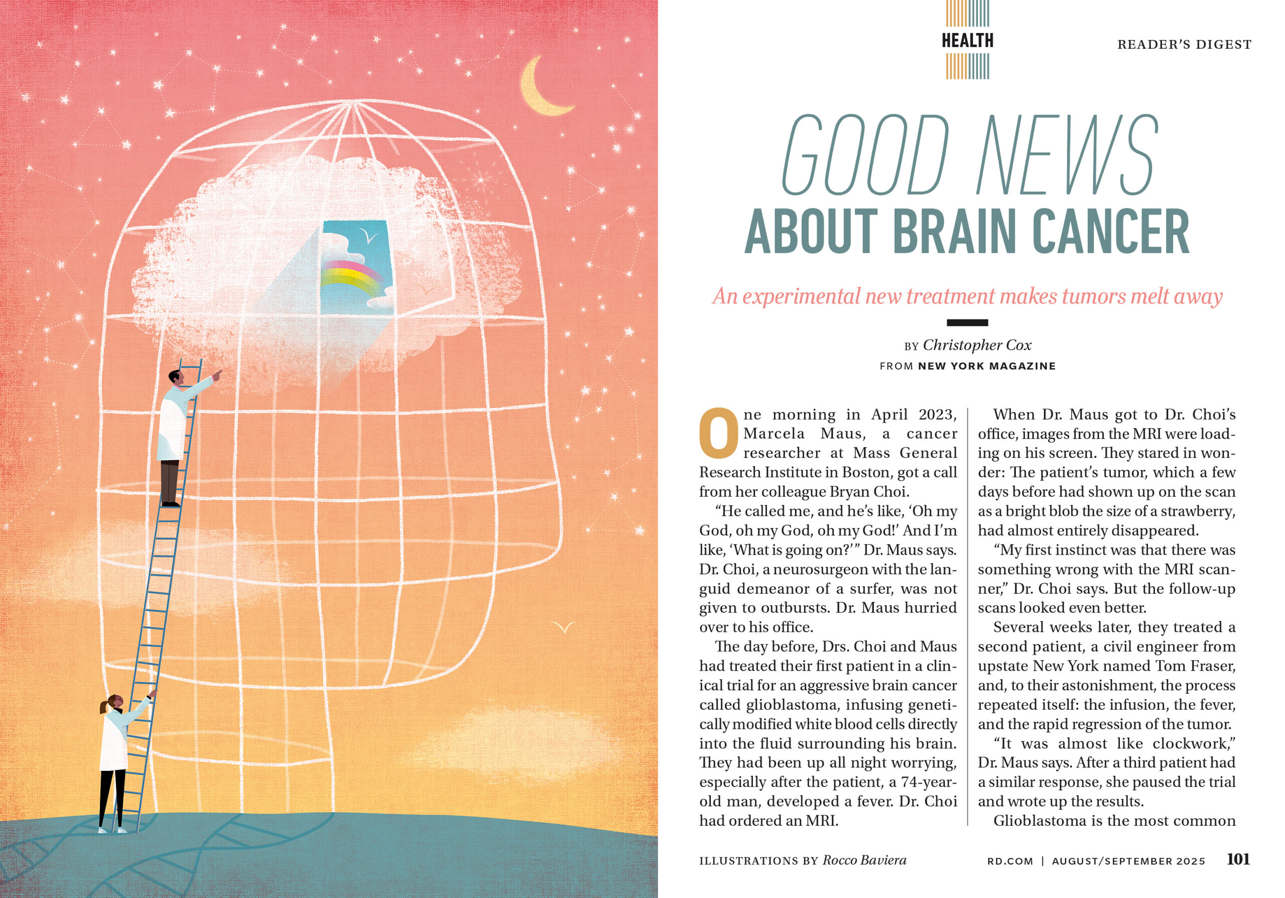 Rocco Baviera illustrated an article in the August/September issue of Reader’s Digest about an experimental immunotherapy treatment for brain cancer that “makes tumors melt away”, and the story of one of the first patients to receive it.
