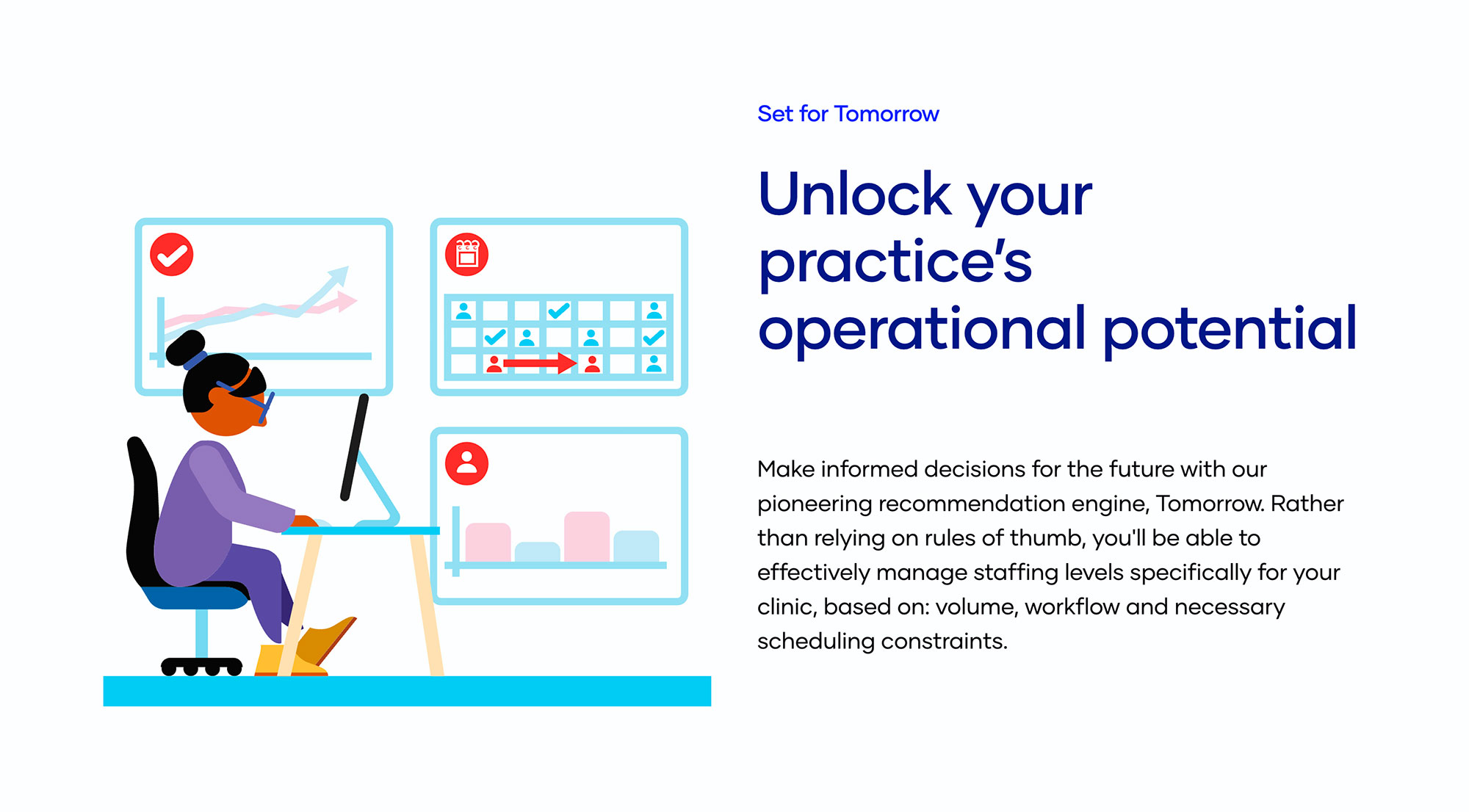 Ben the Illustrator created a series of illustrations for the new website for TeamBuilder, a staff-scheduling platform for the ambulatory care industry. Ben’s artwork helps define the digital management products offered by the TeamBuilder platform: “Today”, “Tonight”, and “Tomorrow”.