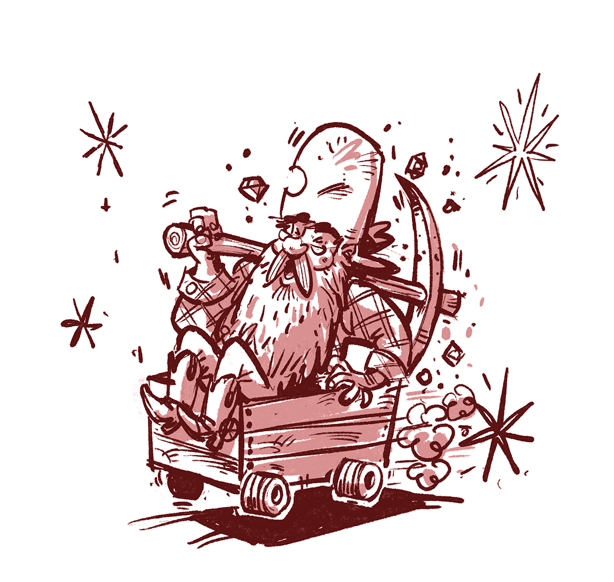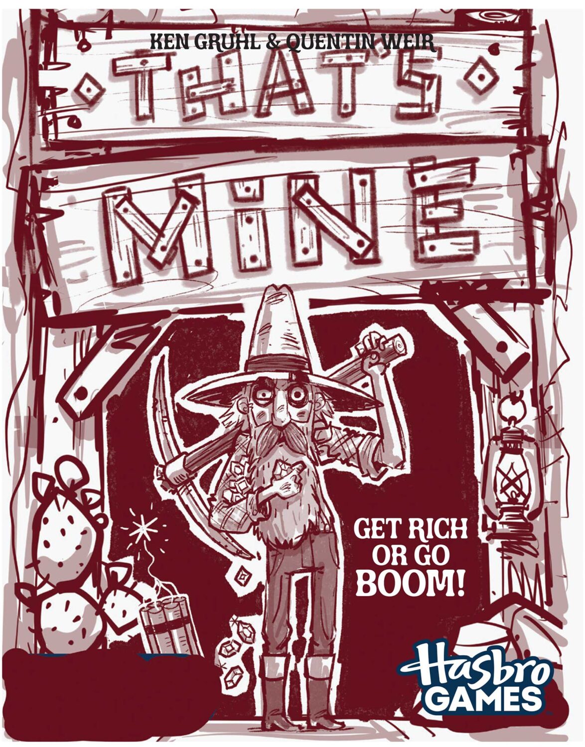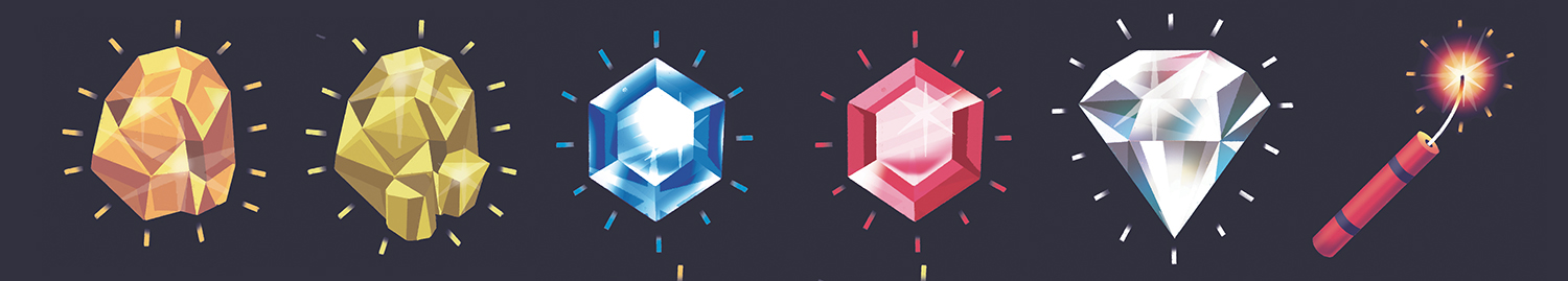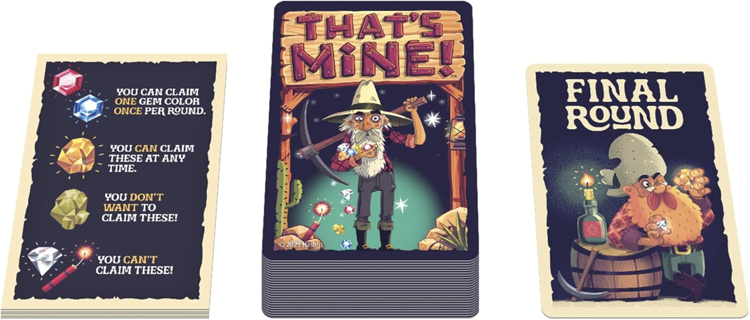 Hasbro commissioned Steve Simpson to create the artwork for That’s Mine!, a new strategy card game in which players have to think quick and slap fast to claim gems and gold nuggets (and avoid losing it all to a dynamite card). Steve’s illustrations of miner characters, backgrounds, lettering, and gem icons are used on the box art, cards and promotional materials.